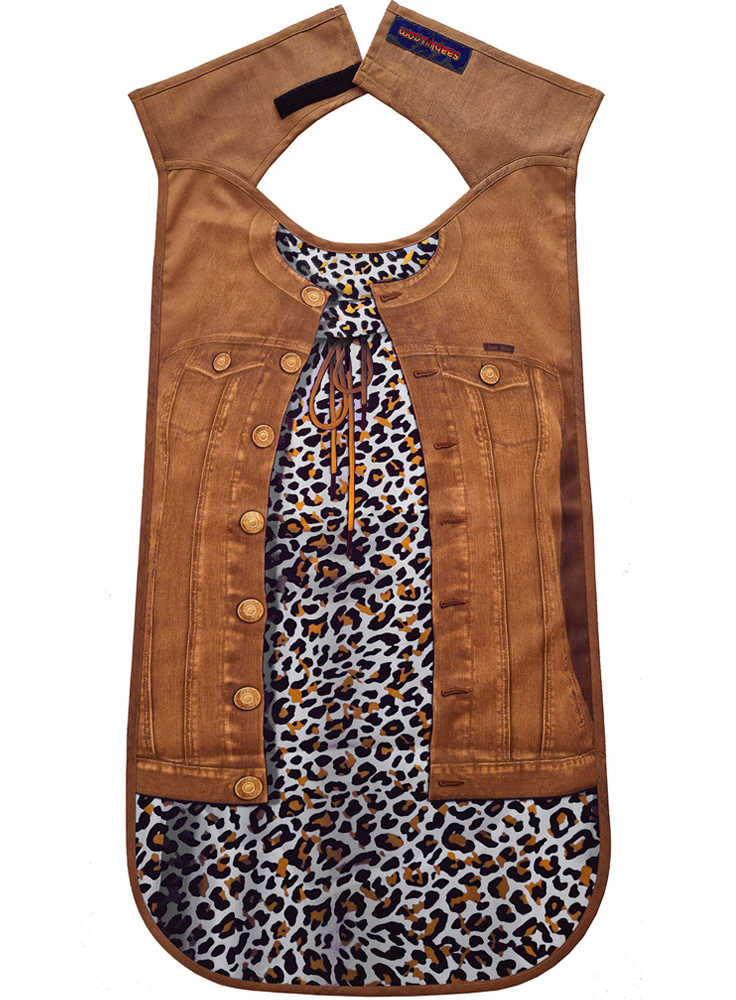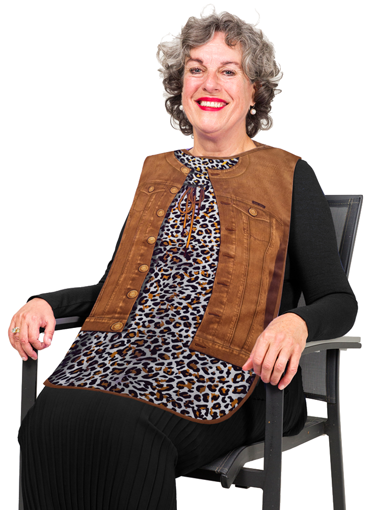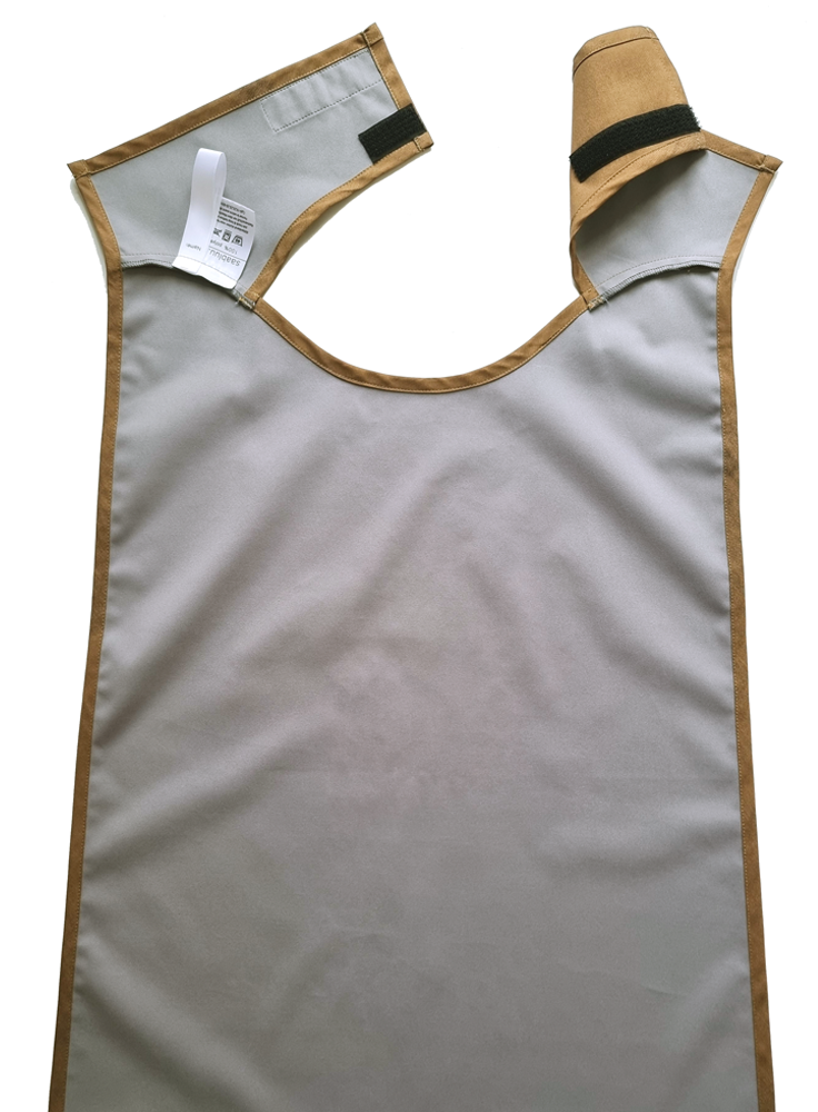 Een menswaardige mooie kledingbeschermer (slab, schort, servet) van een uniek comfortabel materiaal met bijzondere eigenschappen. Dit is een model zonder mouwen en met een verstelbare klittenbandsluiting achter.